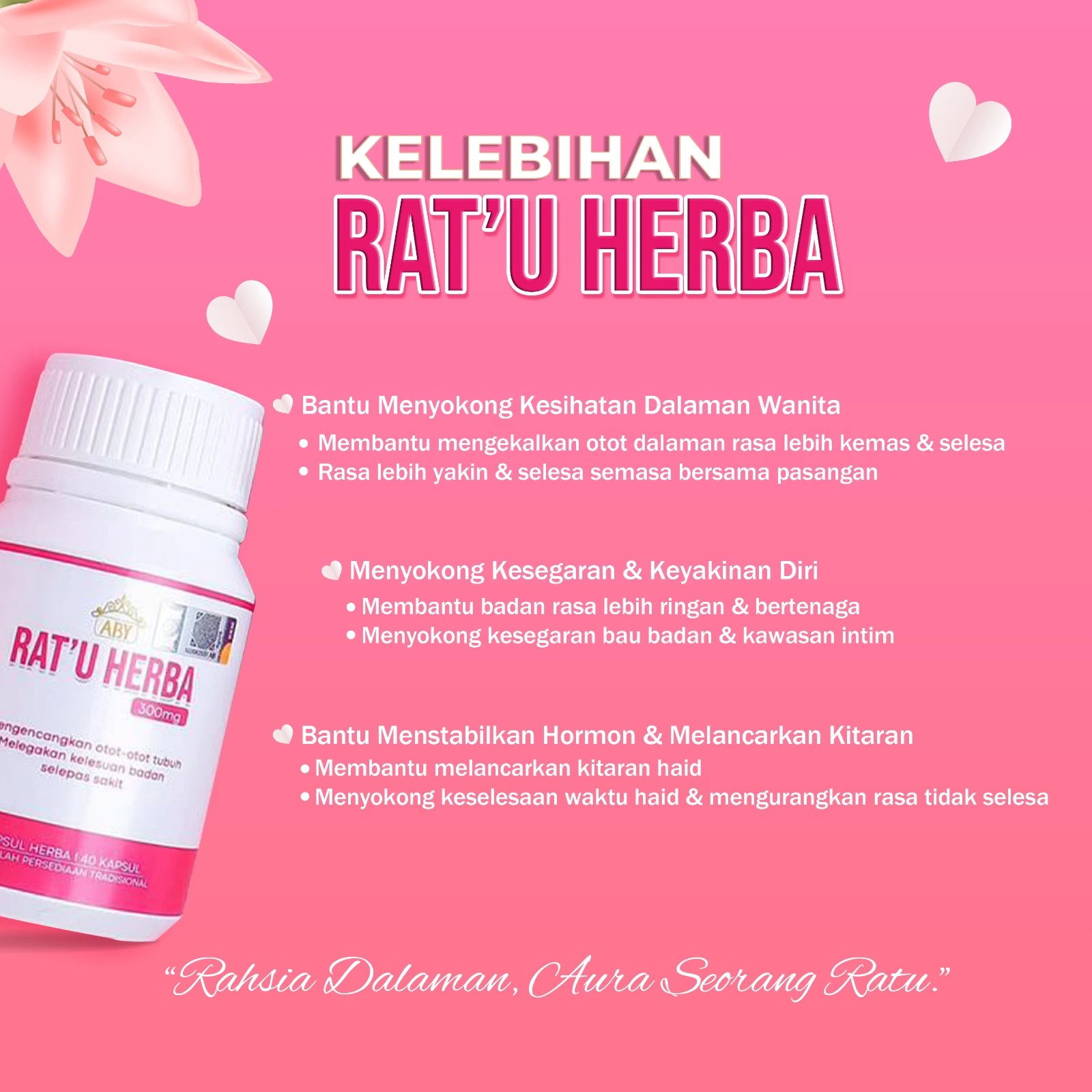 Diformulasikan khas untuk memberi rawatan secara menyeluruh kepada wanita yang mengalami masalah keputihan, haid tidak teratur, hormon tidak stabil, bau badan, rahim lemah, dan ketidakselesaan hubungan suami isteri.